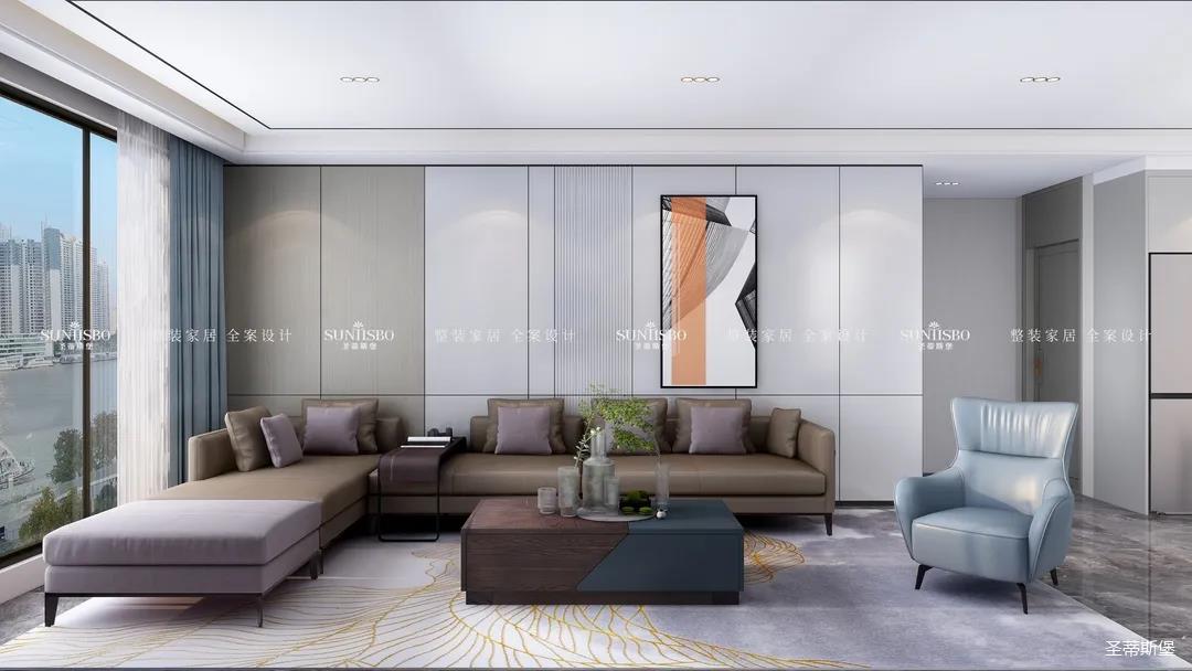 优雅浅灰L型定制柜与纹理清晰的大理石组合电视墙,满足了业主审美与实用的双向需求。一张淡蓝色的休闲椅,让业主能感受到亮丽明艳色彩之外的独特,低调不张扬,却在温润中传递出色彩的力量。通过纹理清晰的护墙为底,为柔和优雅的静态客厅增添了层次感十足的空间律动。